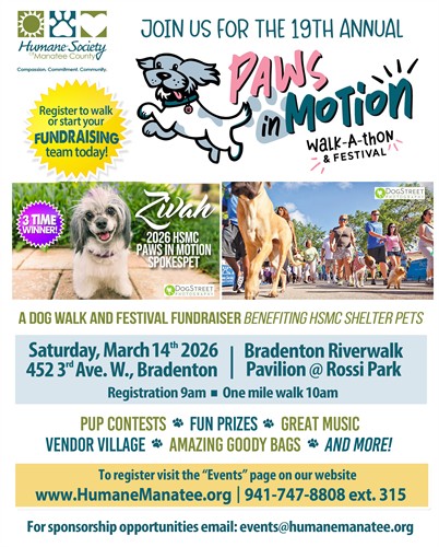Website: www.humanemanatee.org Paws in Motion Walk-a-thon Returns March 14, 2026, to Benefit Humane Society of Manatee County FOR IMMEDIATE RELEASE Bradenton, FL — The Humane Society of Manatee County (HSMC) will host the 19th annual Paws in Motion Walk-a-thon on Saturday, March 14, 2026, bringing together families, dogs, and animal lovers for a morning of fun and fundraising. The event takes place rain or shine from 9:00 a.m. to 1:00 p.m. at the Bradenton Riverwalk Pavilion at Rossi Park (452 3rd Avenue West). On-site registration opens at 9:00 a.m., with the 1.5-mile walk beginning at 10:00 a.m. After the walk, attendees can enjoy music, food trucks, raffle prizes, family-friendly activities, and the popular Vendor Village, featuring local businesses and nonprofit organizations offering pet-related products, services, and educational resources. HSMC will also bring a select group of adoptable dogs for attendees interested in adoption. Paws in Motion is HSMC’s largest fundraiser of the year, with proceeds directly supporting animals at the Second Chance Adoption Center by funding medical care, enrichment, and advocacy until permanent homes are found. Pre-registration is encouraged at www.humanemanatee.org. Fees are $25 for adults, $20 for seniors 62+, and free for children 12 and under. Event-day registration is $30 for adults and $25 for seniors. All registered participants receive an event T-shirt and goody bag. Vendor and sponsorship opportunities remain available. Interested parties may contact events@humanemanatee.org. Founded in 1971, the Humane Society of Manatee County is dedicated to saving lives and strengthening the human-animal bond—one step and one paw at a time. For more information, please contact Jessica Weiss at 941-747-8808 ext. 315 / events@humanemanatee.org / www.humanemanatee.org