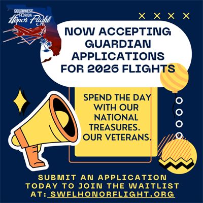 If you know a veteran who has not been on their honor flight, who lives in Charlotte, DeSoto, Hardee, Hendry, Highlands, Manatee, Sarasota (or surrounding) counties, please have them complete an application (found at: www.swflhonorflight.org) and submit. Veterans fly at no-cost to them on their one-time honor flight.