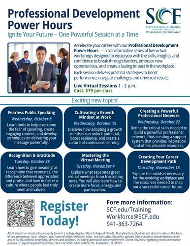 Accelerate your career with our Professional Development Power Hours — a transformative series of live virtual workshops designed to equip you with the skills, insights, and confidence to break through barriers, embrace new opportunities, and create a lasting impact in the workplace. Each session delivers practical strategies to boost performance, navigate challenges, and drive real results.